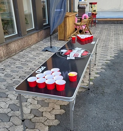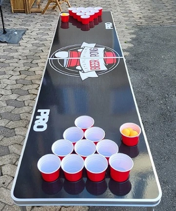 Dags för fest med spel? Då kan ni hyra beerpong med muggar och bollar till er nästa fest av oss. Tack vare hålen på bordet varken flyttas eller välter muggarna under spelets gång. Vätskespill blir betydligt mindre jämfört med ett bord utan hål. Om ni råkar spilla är ytan enkel att torka av då ytan är vätskeavvisande. En rolig och enkel aktivitet för de flesta festliga sammanhangen.