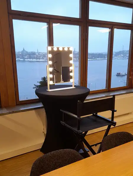 Hyra sminkstation innehållande sminkspegel, sminkstol och ståbord med strumpa från 1000 kr ex moms. Våra fina sminkstationer är populära tillval till våra fotoaktiviteter men också mycket annat. Vi har bland annat hjälpt till på sminkevent, tv-sändningar, företagsfester och flera middagar med influensers.