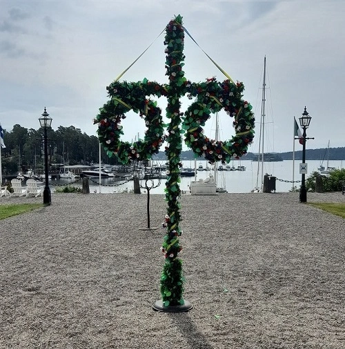 Vi gör också midsommarstänger på beställning i andra storlekar och kan klä stängerna med levande björk och riktiga blommor. Priset varierar beroende på storlek, var den ska stå, och om det ska vara konstgjorda kransar eller kransar med färska blommor.