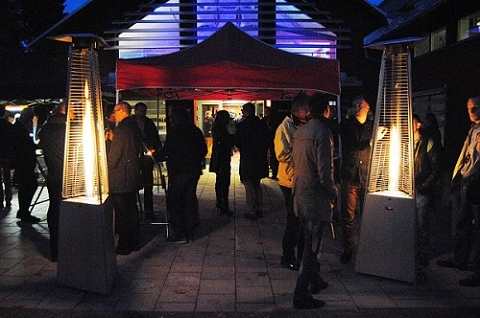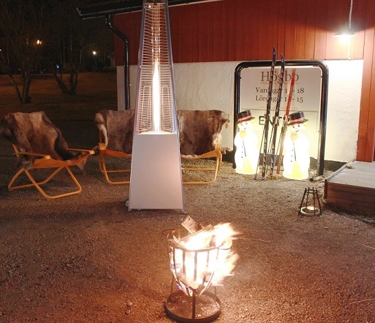 Hyra terrassvärmare för att t.ex. göra en snygg entré eller lite värme i tältet. Värmarna har en eldlåga i mitten som går upp genom ett glasrör vilket gör de visuellt snygga. Vi har 6 stycken. För att lysa upp ännu mer kan ni även hyra eldkorgar och lysande snögubbar.